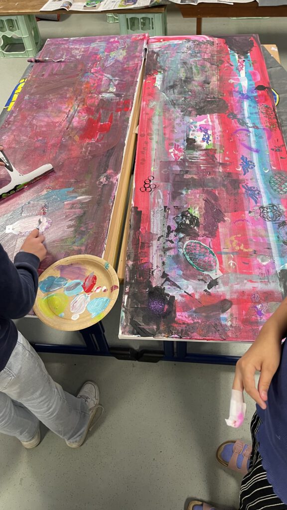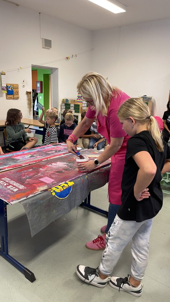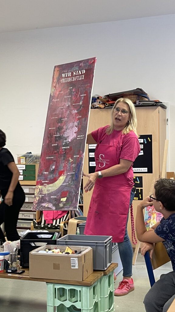 In der Willkommenswoche hat die 4b viele tolle Aktionen erlebt. Wir haben mit der Künstlerin Silke Ferber aus Brühl gemeinsam ein tolles Kunstwerk erschaffen – jetzt müssen wir nur noch überlegen, wo wir es in der Schule aufhängen.